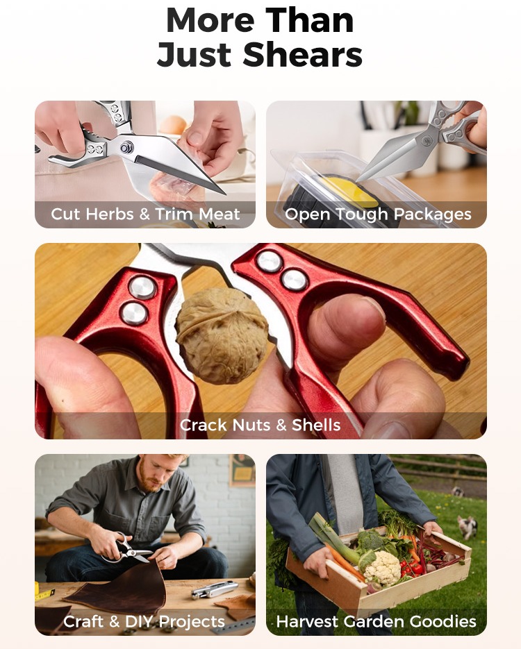 VERSATILE CUTTING TOOL - Our multifunctional kitchen shears are designed to handle various tasks, from cutting meat and herbs to opening packages and even cracking walnut. Enjoy a single tool that simplifies your kitchen prep work.