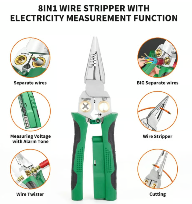 8-in-1 Wire Stripping Pliers With Voltage Test Feature, Offering Convenience And Accuracy For Electrical Work. Say Goodbye To Multiple Tools With This All-in-one Solution. suitable For AWG 18, 14, 12, 10, 6/1.0, 1.5, 2.0, 2.5, 4.0mm²; Cape Cable 25mm² Wire, Open Cable Outer Skin, Divide Wiring 2*1.5mm²