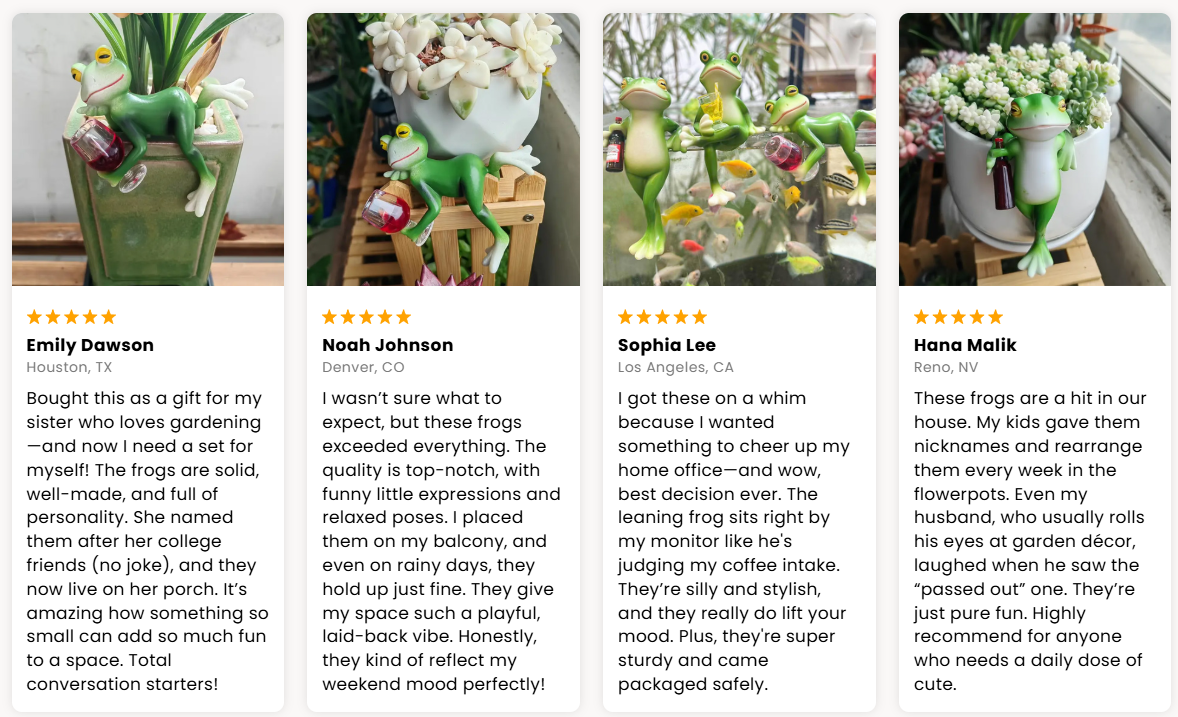 Tired of boring flower pots that just sit there? Meet the Tipsy Frog that’s ready to turn your flower pot into a laugh-out-loud zone! These hilarious tipsy frogs—one sprawled out, one sitting proud, and one casually leaning—aren’t just decorations, they’re instant mood-lifters.