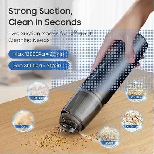 POWERFUL SUCTION FOR ANY MESS-Tackle dust, debris, pet hair, sand, or crumbs in seconds with serious suction power. Featuring two adjustable suction modes (Eco/Max), this portable vacuum effortlessly handles both everyday spills and tougher cleaning tasks in your car, home, or workspace.