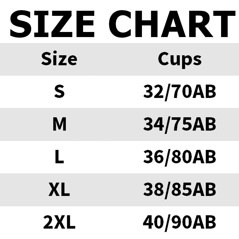 Size: S (32/70AB), M (34/75AB), L (36/80AB), XL (38/85AB), 2XL (40/90AB)