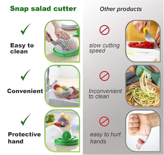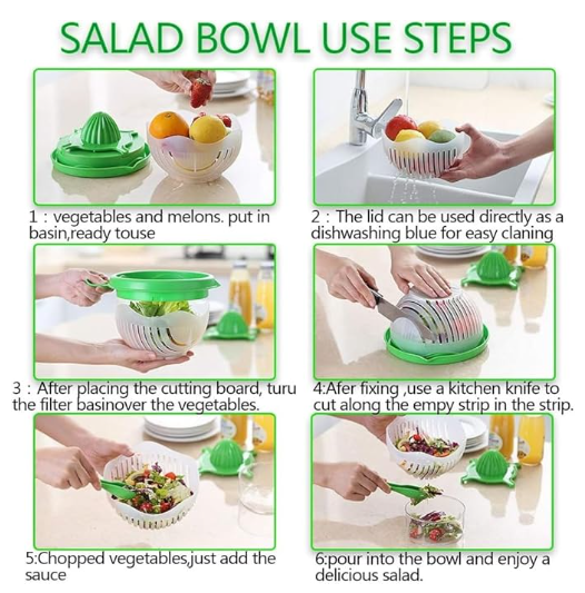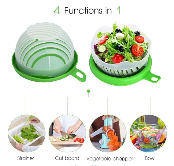 4 Functions in 1 BowlMake fast salad with less tools. Vegetable Bowl + Water Strainer + Cutting Board + Safe Slicer = Our Salad Maker Bowl.